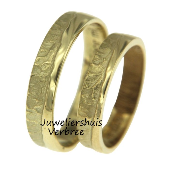 Geelgouden trouwringen met een verfijnd patroon dat het klassieke ontwerp een unieke uitstraling geeft.